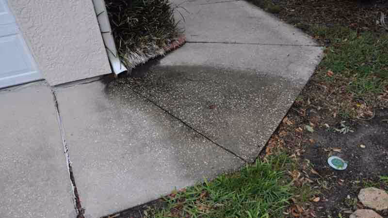 Central Florida well water contains high iron content that creates orange rust streaks on concrete near sprinkler heads. We use targeted rust removers that dissolve iron deposits without bleaching or discoloring your sidewalks. The treatment works on contact and rinses away completely.